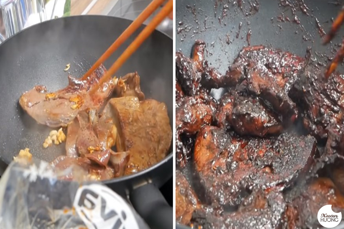 Bạn xào đến khi cháy đen thì chế phần nước sốt còn lại trong bao ni lông vào chảo. Thỉnh thoảng trở mặt của tim, gan lại cho nước sốt thấm đều.