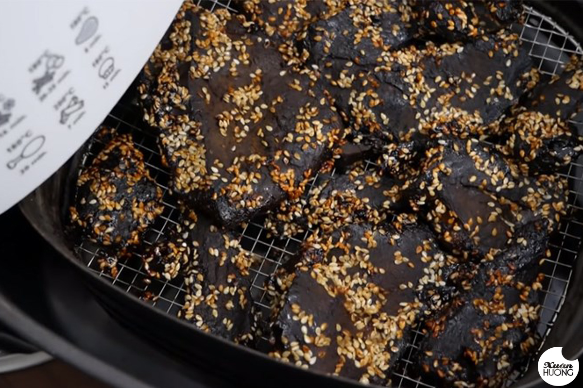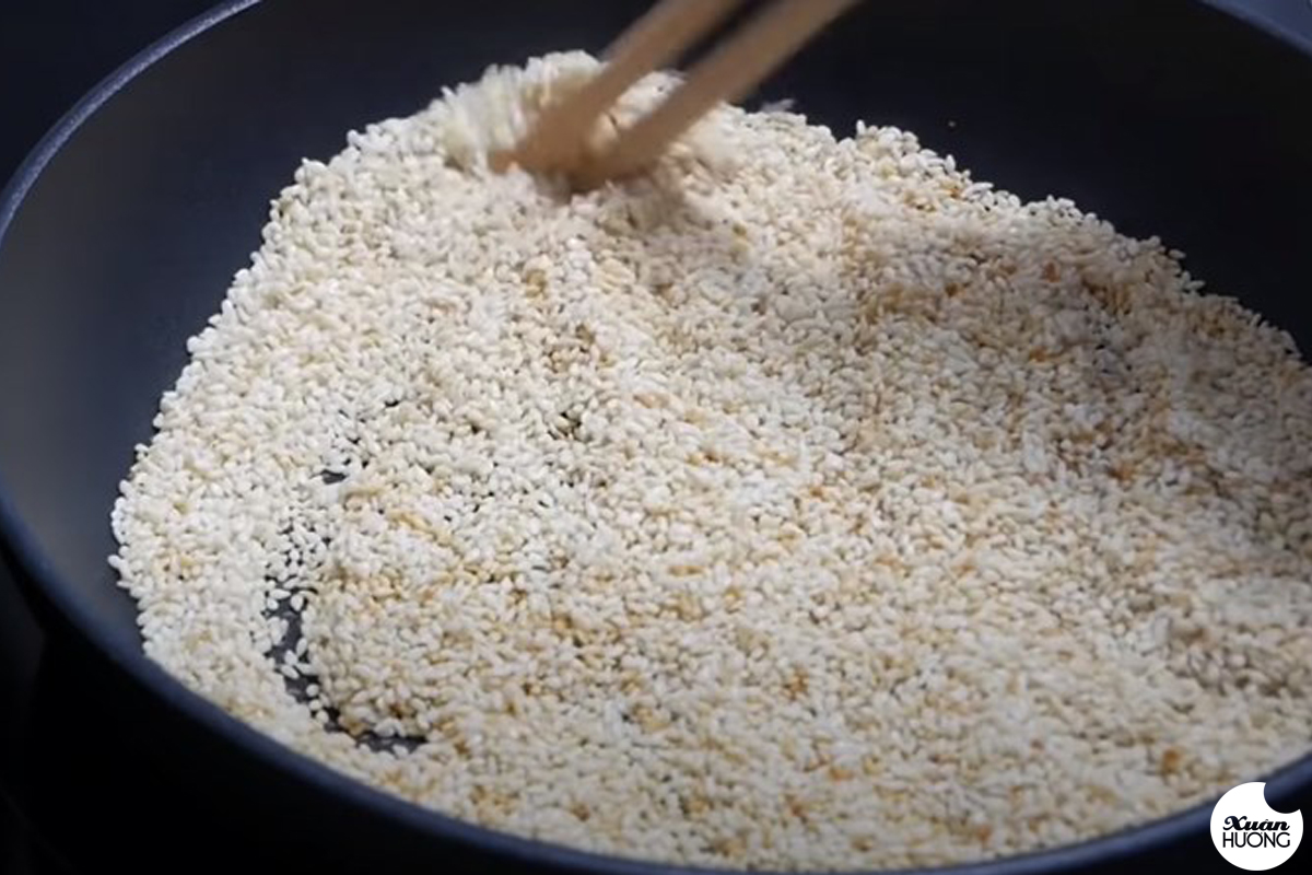 Rang mè trên chảo với lửa nhỏ, đảo đều tay trong 2 - 3 phút hoặc khi hạt mè có màu nâu, bóng và đôi khi nghe tiếng nổ lách tách hoặc một vài hạt nảy lên là được.