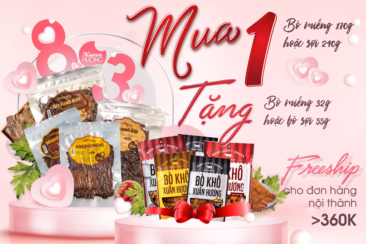 Chào mừng ngày Quốc Tế Phụ Nữ 8/3 – ngày tôn vinh phái đẹp, Bò khô Xuân Hương gửi đến chương trình khuyến mãi và quà tặng dành cho những đơn hàng cụ thể như sau: