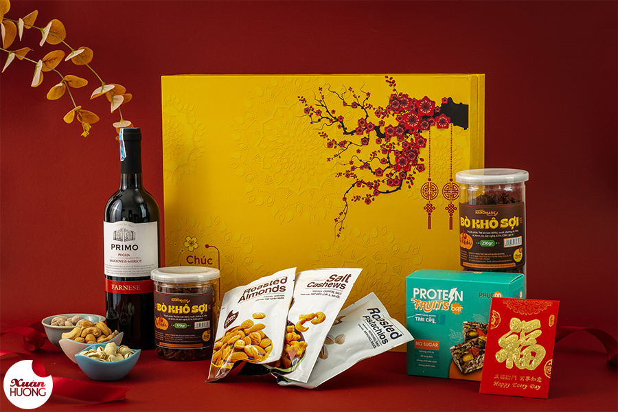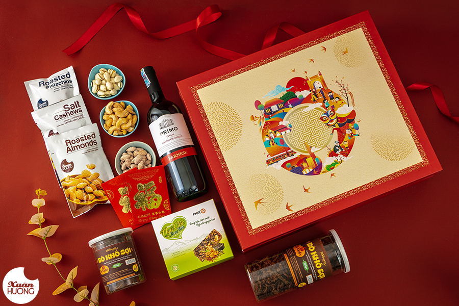 - Set quà bao gồm: 1 chai rượu Primo, 1 gói bò miếng 190g, 1 gói bò sợi 250g, 1 gói hạt điều 500g, 1 gói hạt dẻ cười 500g, 1 hộp ngũ cốc dinh dưỡng Phúc An, 1 hộp hạnh nhân 100g, 1 hộp quà Xuân Hương size 40x40 x 10cm