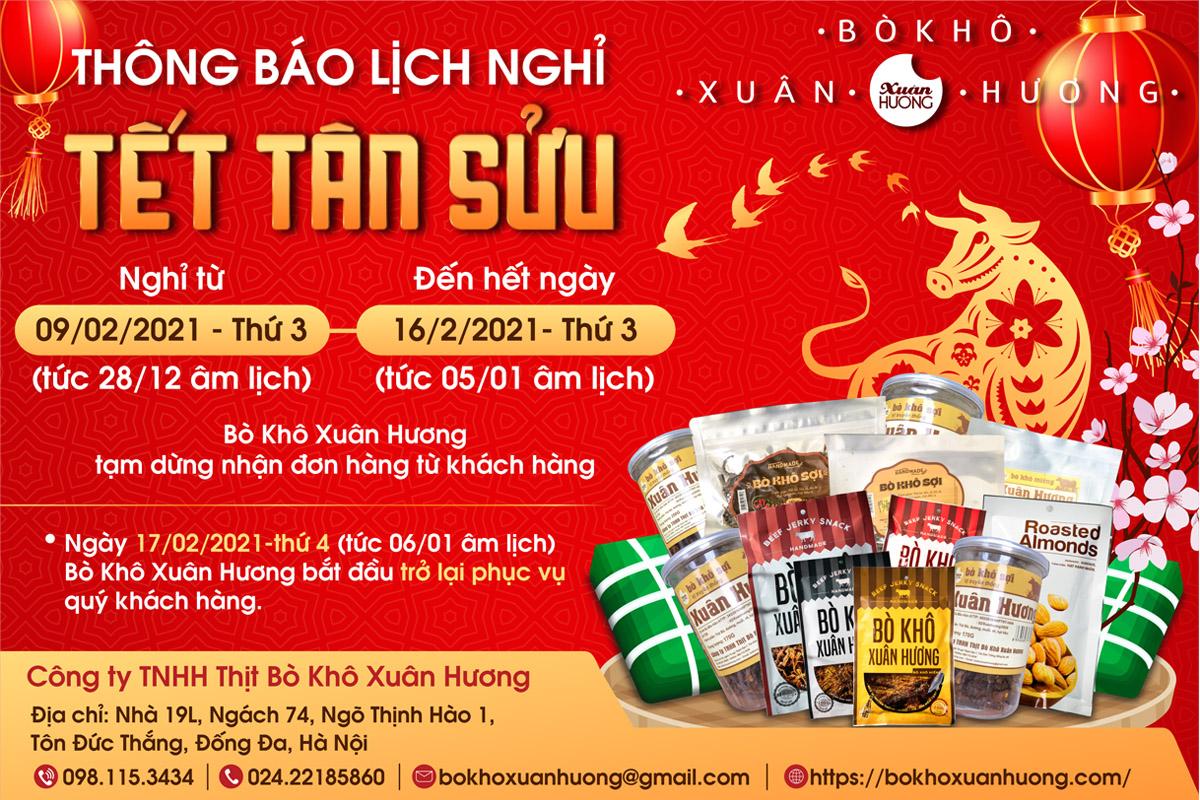 Bò khô Xuân Hương xin trân trọng thông báo lịch nghỉ Tết Nguyên Đán 2021 cụ thể như sau: